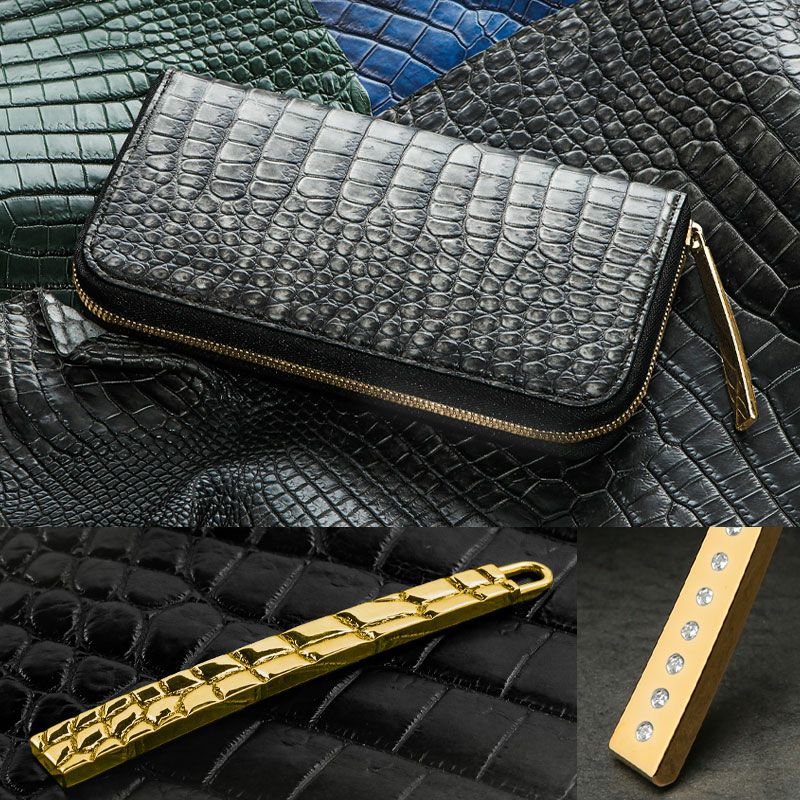 【池田工芸】《一期一会シリーズ》「10億分の1」の出逢い。世界の誰とも被らない、最強の個性「三千墨染め」クロコダイル一枚革財布 「黒×金」&『ダイヤモンド・18金カーブカン』モデル【5月28日頃出荷】
