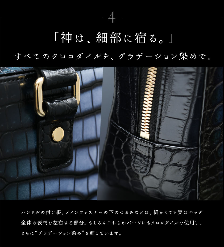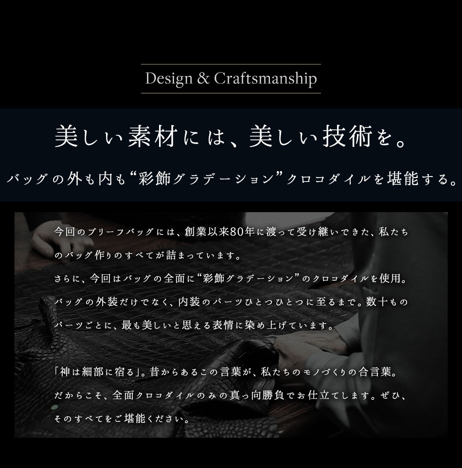 こちらは、史上最高傑作の透明感を叶えた「彩飾クロコダイル」仕立てのブリーフバッグ。