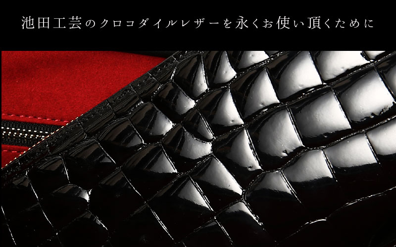 池田工芸の艶クロコダイルは瑪瑙磨きによる艶出しを特徴としており、その磨きで生まれた繊細な光沢を出来る限り自然な形で保護するため表面を保護剤で仕上げております。一般的なエナメル加工レザーがエナメル樹脂によって光沢を出している物と異なり、瑪瑙石の磨きによる自然な光沢を妨げないように保護剤は限りなく薄づきとさせて頂いているため、保護剤は表皮自体の摩耗の全てをカバーするものではない事、どうぞご了承ください。